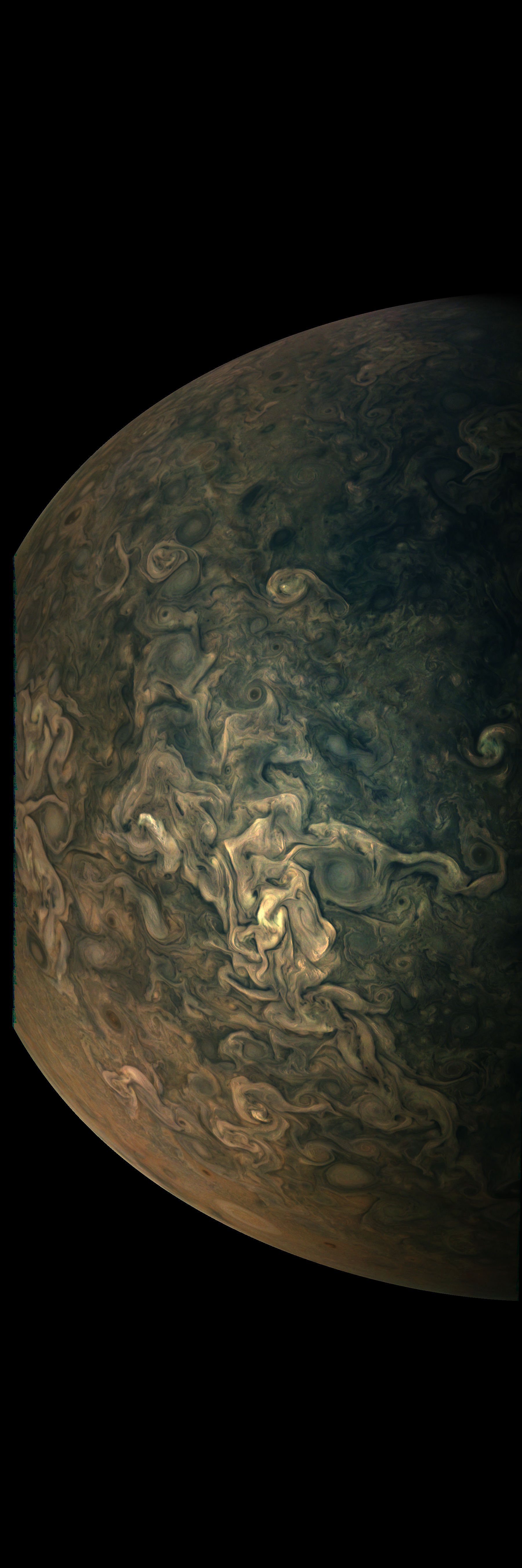 Resolution is 30 pixels per degrees in an equidistant cylindrical system centered to the camera at image stop time, with an axis parallel to Juno's spin axis. The rendered field of view is 60x180 degrees.
