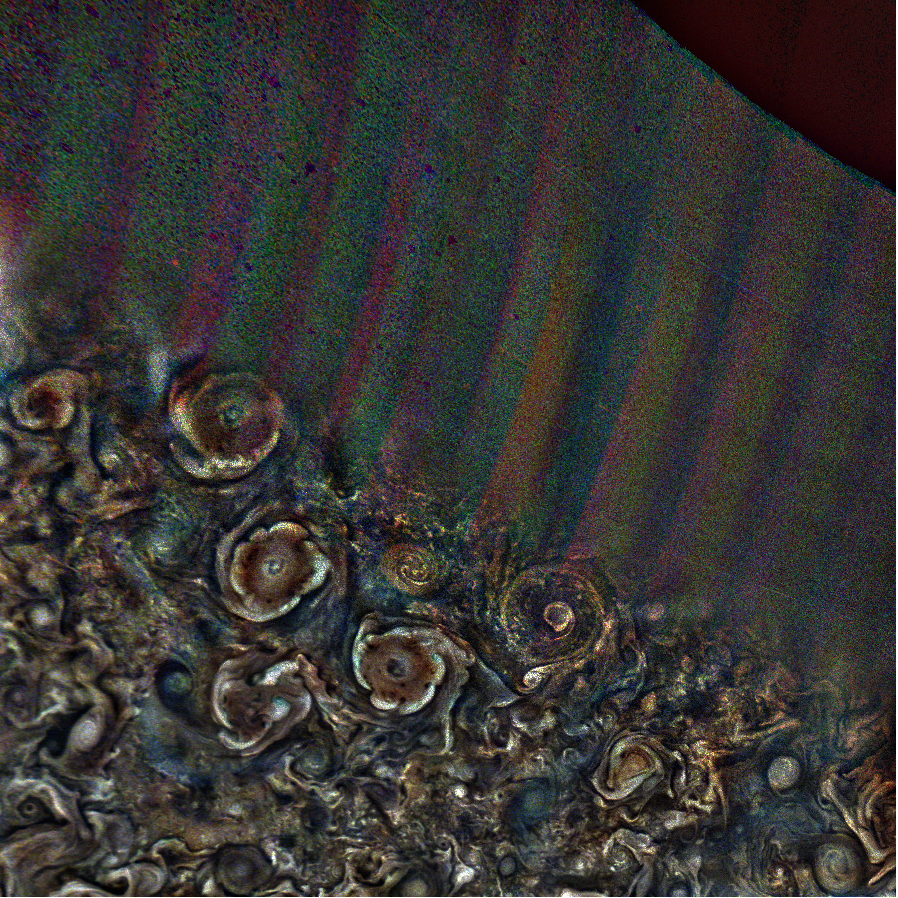 Junocam pixels are 12 bits deep from the camera but are converted to 8 bits inside the instrument using a lossless "companding" table, a process similar to gamma correction, to reduce their size. All Junocam products on the missionjuno website are in this 8-bit form as received on Earth. Scientific users interested in radiometric analysis should use the "RDR" data products archived with the Planetary Data System, which have been converted back to a linear 12-bit scale.