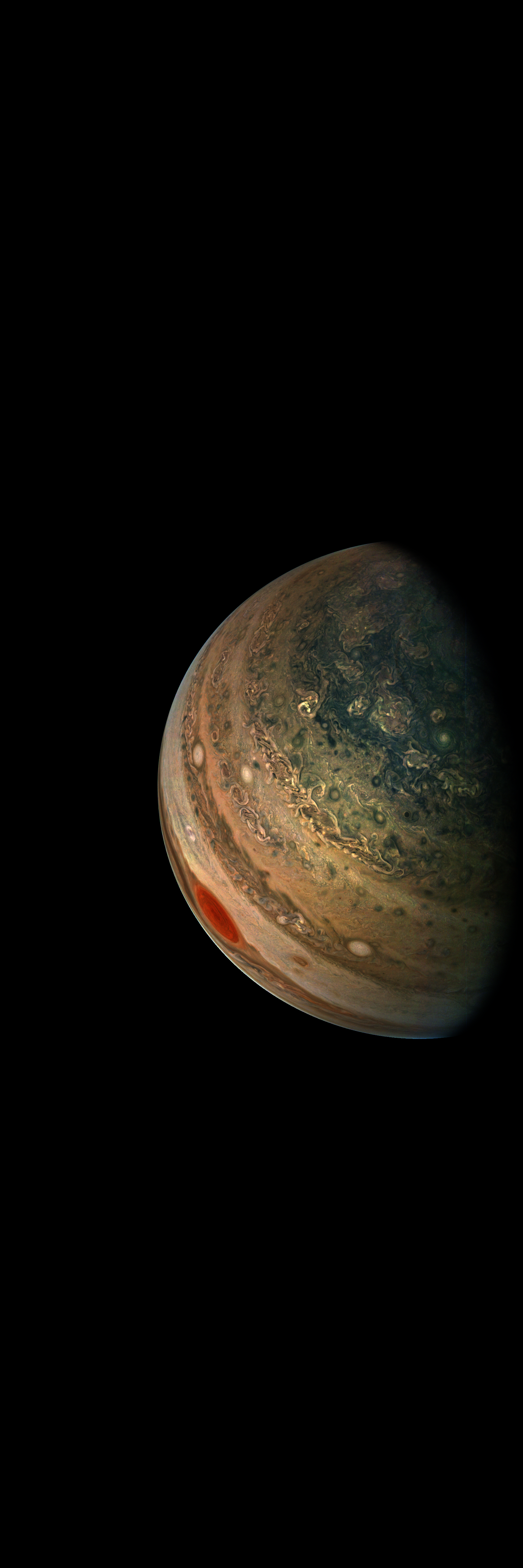 Resolution is 30 pixels per degrees in an equidistant cylindrical system centered to the camera at image stop time, with an axis parallel to Juno's spin axis. The rendered field of view is 60x180 degrees.