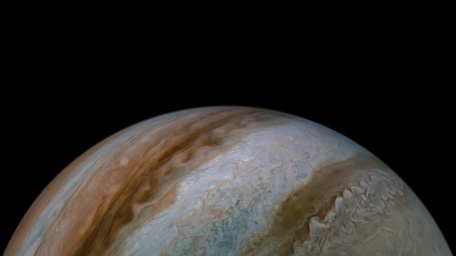 Processed using the JunoCam imager's PJ30 South South Tropical Belt raw images and data from NASA's Juno spacecraft flyby on November 8, 2020. Enhanced to highlight features, clouds, colours, and the beauty of Jupiter. Artist's impression - not representative of true colour.
