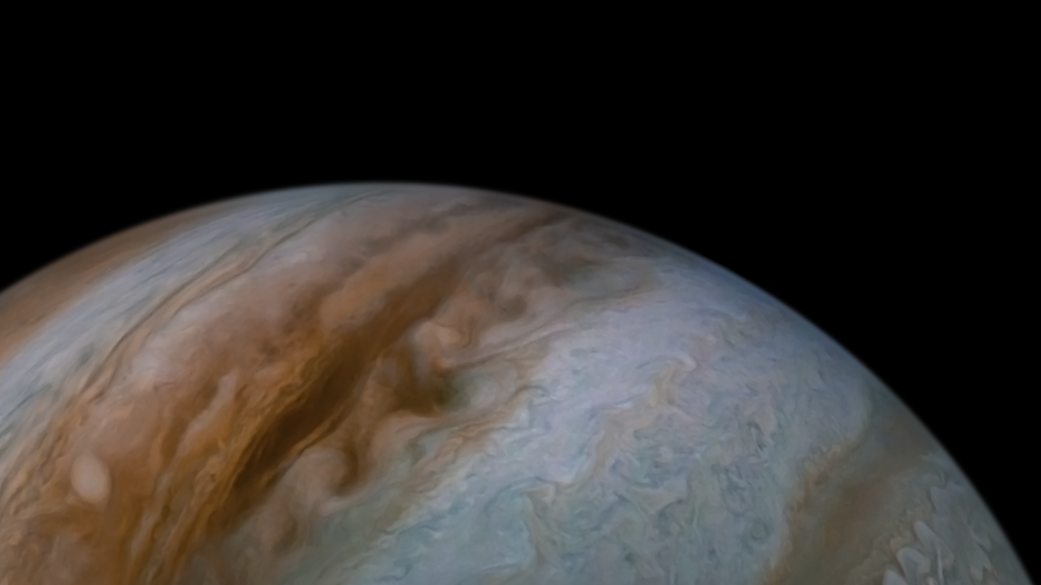 Processed using the JunoCam imager's PJ30 South Tropical Band South raw images and data from NASA's Juno spacecraft flyby on November 8, 2020. Enhanced to highlight features, clouds, colours, and the beauty of Jupiter. Artist's impression - not representative of true colour.