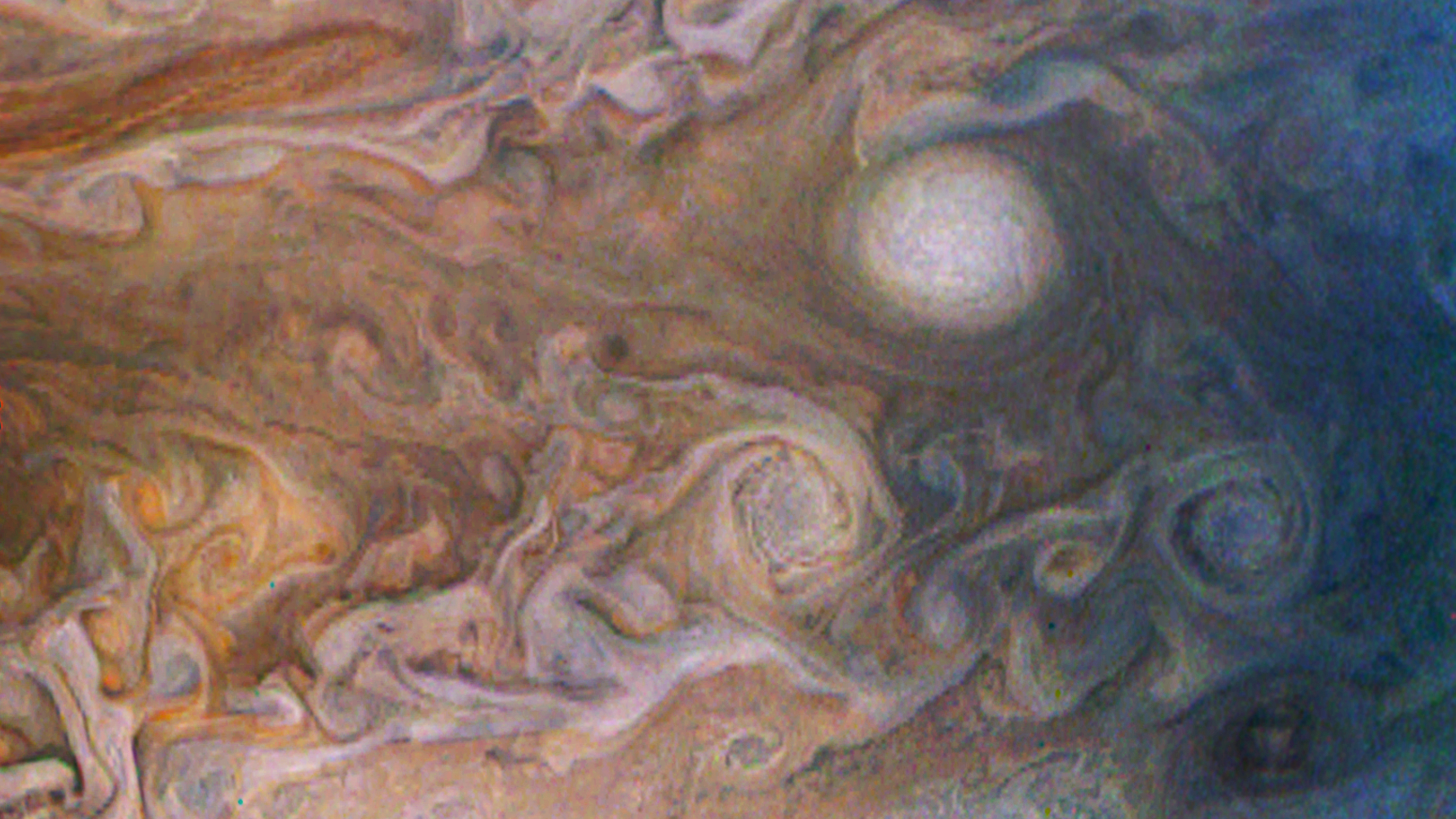 Enhanced contrast, colour balance, minor filter and crop to highlight the beauty of Jupiter's pearls