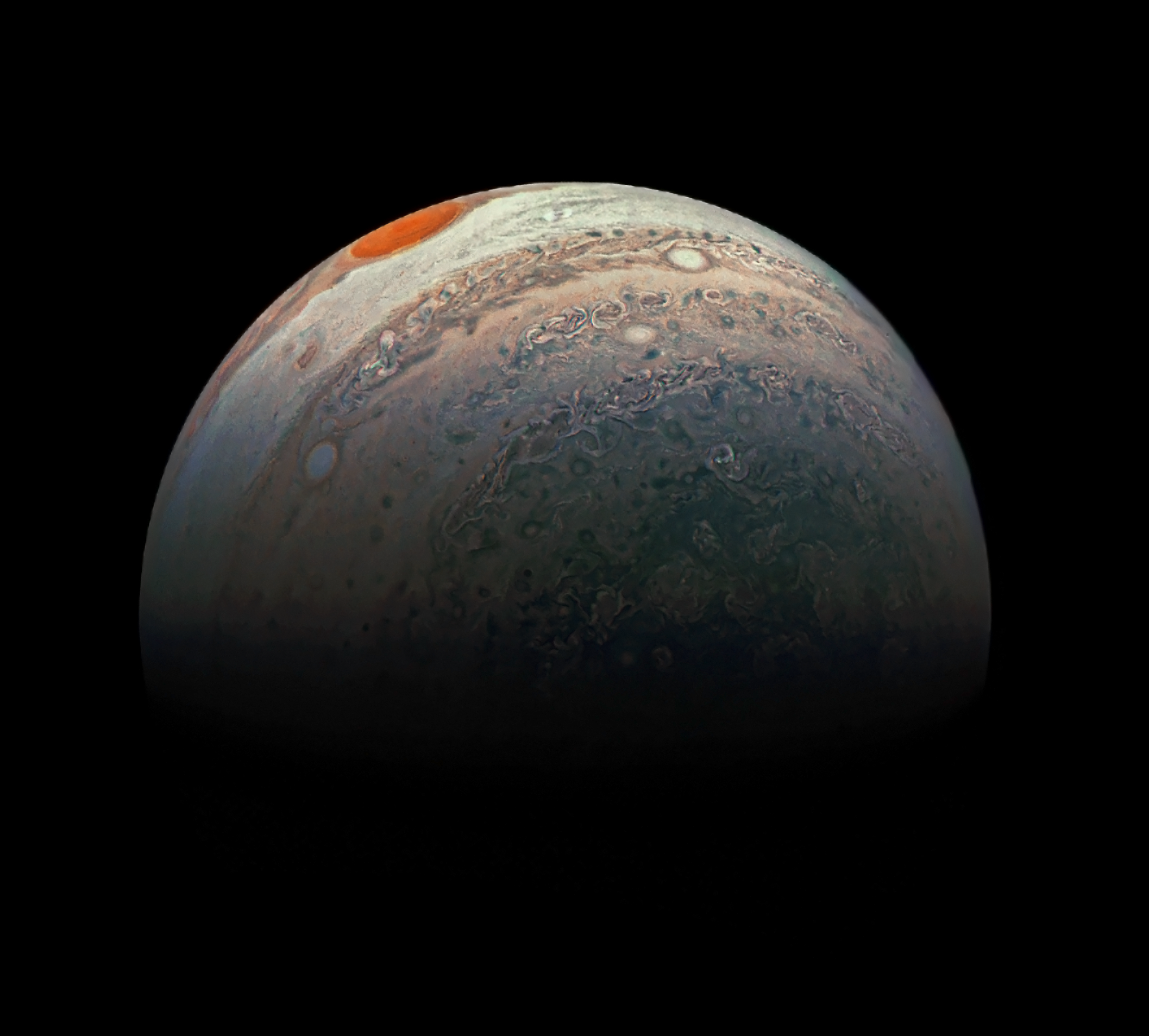 In this view of Jupiter as seen by the Juno spacecraft, the Great Red Spot is rising, beneath it, are a few white ovals.