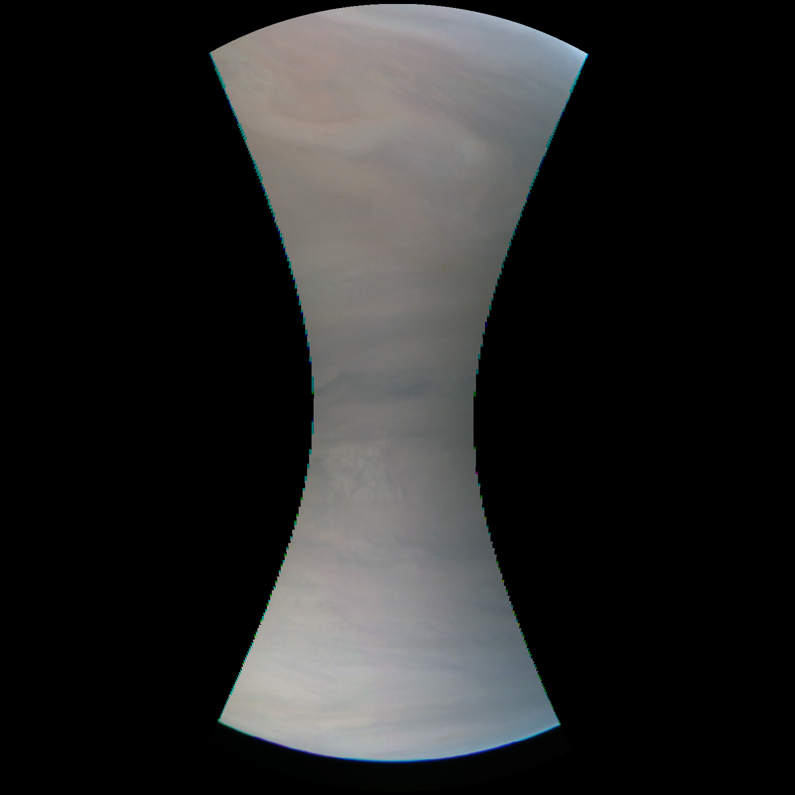 Junocam pixels are 12 bits deep from the camera but are converted to 8 bits inside the instrument using a lossless "companding" table, a process similar to gamma correction, to reduce their size. All Junocam products on the missionjuno website are in this 8-bit form as received on Earth. Scientific users interested in radiometric analysis should use the "RDR" data products archived with the Planetary Data System, which have been converted back to a linear 12-bit scale.