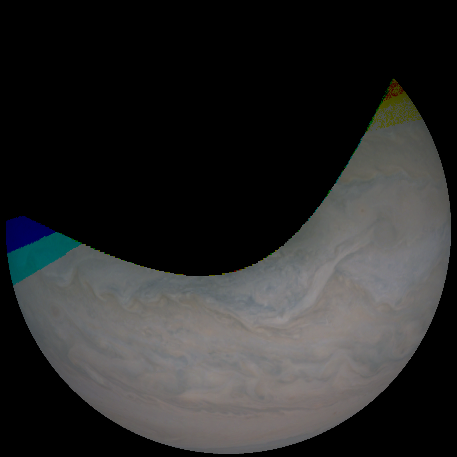 Junocam pixels are 12 bits deep from the camera but are converted to 8 bits inside the instrument using a lossless "companding" table, a process similar to gamma correction, to reduce their size. All Junocam products on the missionjuno website are in this 8-bit form as received on Earth. Scientific users interested in radiometric analysis should use the "RDR" data products archived with the Planetary Data System, which have been converted back to a linear 12-bit scale.