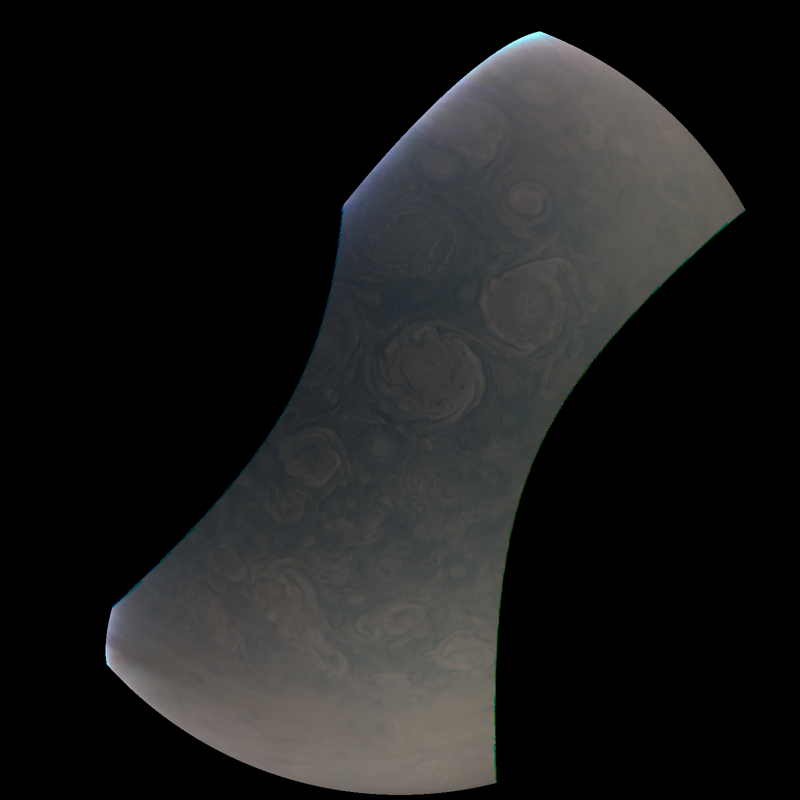 Junocam pixels are 12 bits deep from the camera but are converted to 8 bits inside the instrument using a lossless "companding" table, a process similar to gamma correction, to reduce their size. All Junocam products on the missionjuno website are in this 8-bit form as received on Earth. Scientific users interested in radiometric analysis should use the "RDR" data products archived with the Planetary Data System, which have been converted back to a linear 12-bit scale.