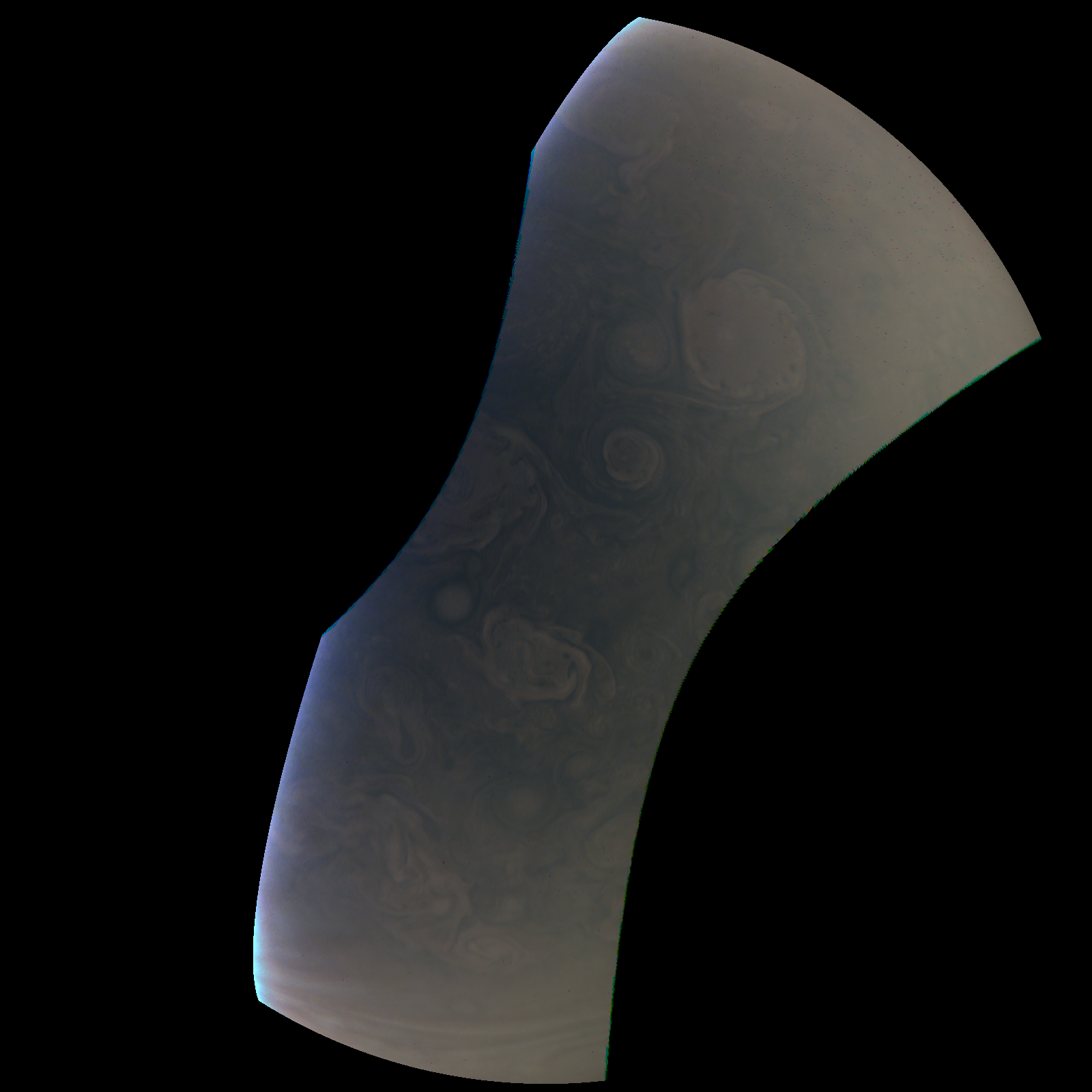 Junocam pixels are 12 bits deep from the camera but are converted to 8 bits inside the instrument using a lossless "companding" table, a process similar to gamma correction, to reduce their size. All Junocam products on the missionjuno website are in this 8-bit form as received on Earth. Scientific users interested in radiometric analysis should use the "RDR" data products archived with the Planetary Data System, which have been converted back to a linear 12-bit scale.