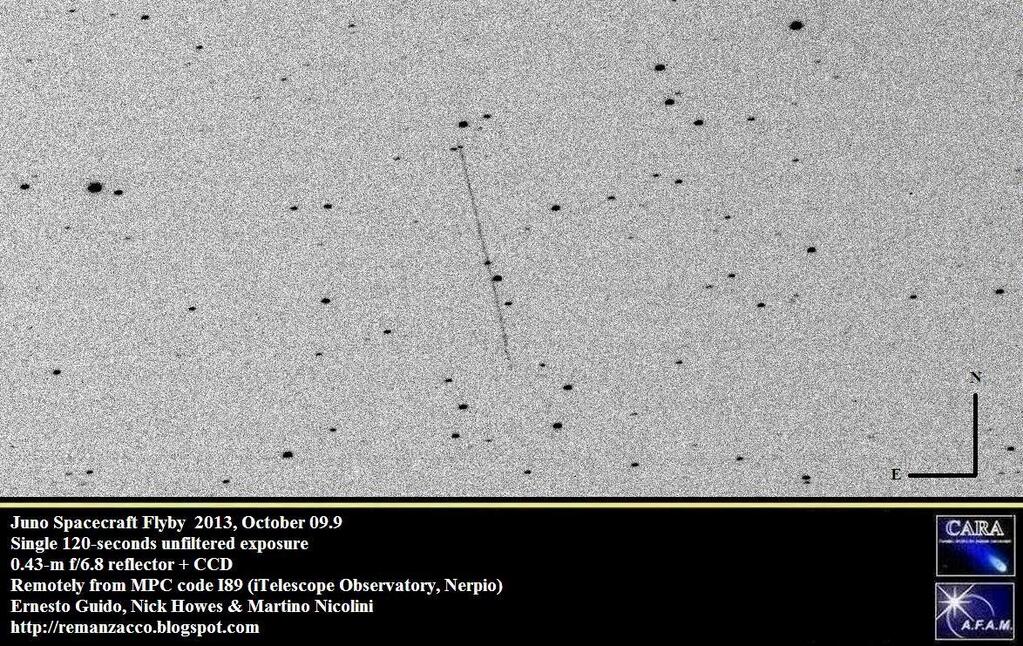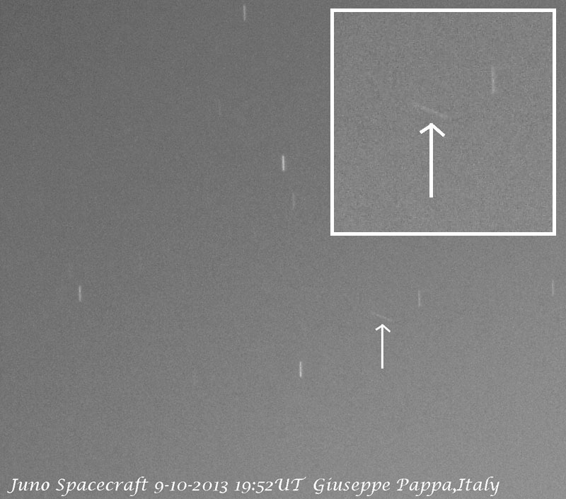 A couple of hours after Juno passed by Earth on Oct. 9, 2013, British observer Nick James used an 11-inch Schmidt-Cassegrain telescope to obtain this sequence of five-second exposures, showing the spacecraft moving against the background stars.