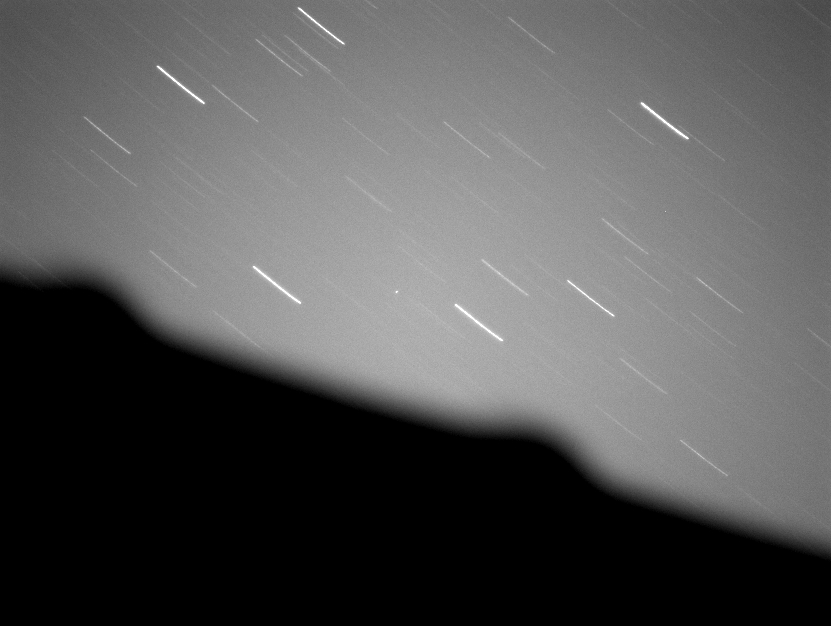 spacecraft is the point-like object near center; the linear streaks are background stars. The dark shape across the