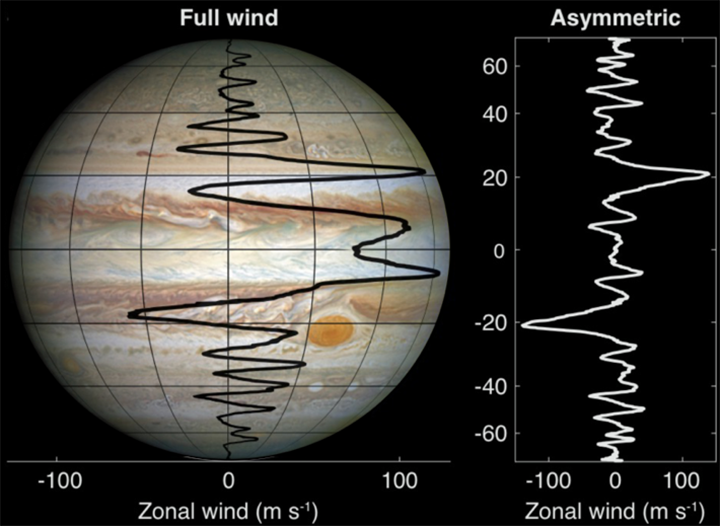 Jupiter’s belts and zones represent east-west jet-streams that show a clear north-south asymmetry.